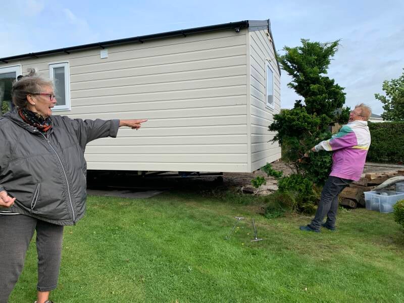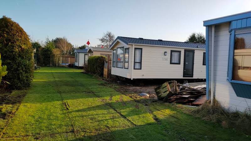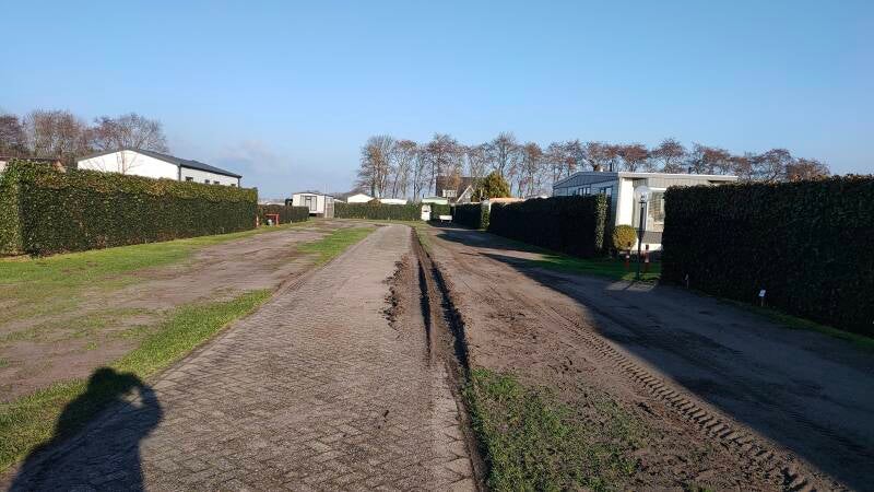Gelukkig was het woensdag mooi weer, maar met moeite ging caravan nr 58 door de ingang. Ook nr 56 is vervangen. De tuinen moeten nog wel hersteld. Voor de bewoners is het een hele verbetering.